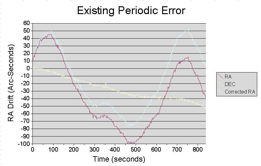 Shortly after I bought my telescope I also bought the standard EQ3-2 dual-axis drives. These work fine for general observation and it was only when I started using a webcam that I noticed that the periodic error would limit me severely in what I could image. Using the Drift Explorer in K3CCDTools I logged the drift in the scope and generated this graph -